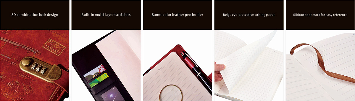 Diese Tagebücher mit einem Schloss sind mit einem exquisiten Metallkombinationsschloss ausgestattet. Es ist nicht nur eine physische Barriere, sondern auch ein sanfter Wächter der inneren Welt.