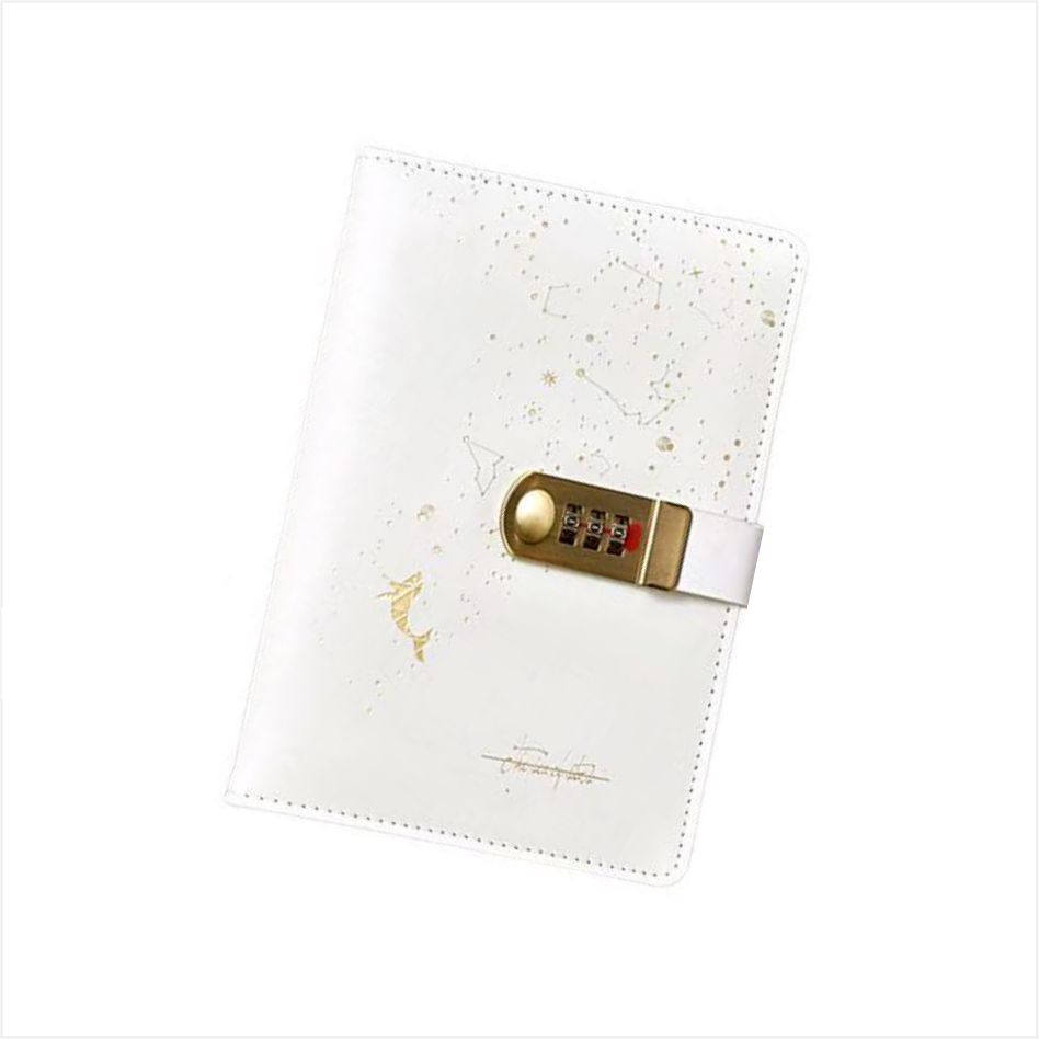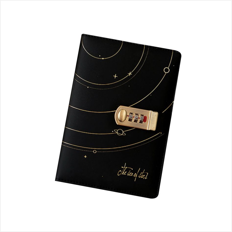 Der Einband dieses Tagebuchs mit Schlüssel besteht aus exquisiter vergoldeter Technologie, die eine Flugbahn ähnlich einer Planetenumlaufbahn mit einfachen Linien umreißt, die mit kleinen Punkten wie Sternen übersät sind, als ob sie den geheimnisvollen Nachthimmel in das Bild verdichten würden, ruhig und voller Fantasie. Es ist mit einem goldenen Zahlenschloss aus Metall ausgestattet, das über ein dreistelliges Passwort gesteuert wird. Sie können Ihr eigenes Passwort festlegen, um sicherzustellen, dass nur Sie den Inhalt öffnen können.