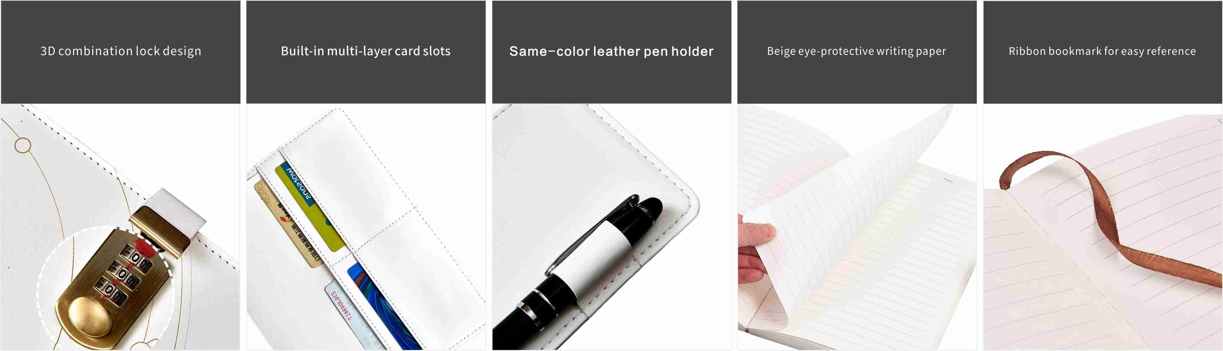 An der Seite des Buches befindet sich ein Stifteinsatz, in den Sie den Stift für den täglichen Gebrauch bequem legen können. Wenn Sie etwas aufzeichnen müssen, können Sie den Stift nehmen und beiläufig schreiben. Das Notizbuch ist mit einer integrierten Tasche ausgestattet, die zum Aufbewahren von Karten verwendet werden kann. Diese eignet sich sehr gut zum Aufbewahren von Karten (z. B. Ausweisen oder Bankkarten), temporären Notizen oder kleinen wichtigen Gegenständen und macht das Tagebuch zu einem multifunktionalen Organizer, der sich leicht transportieren lässt.