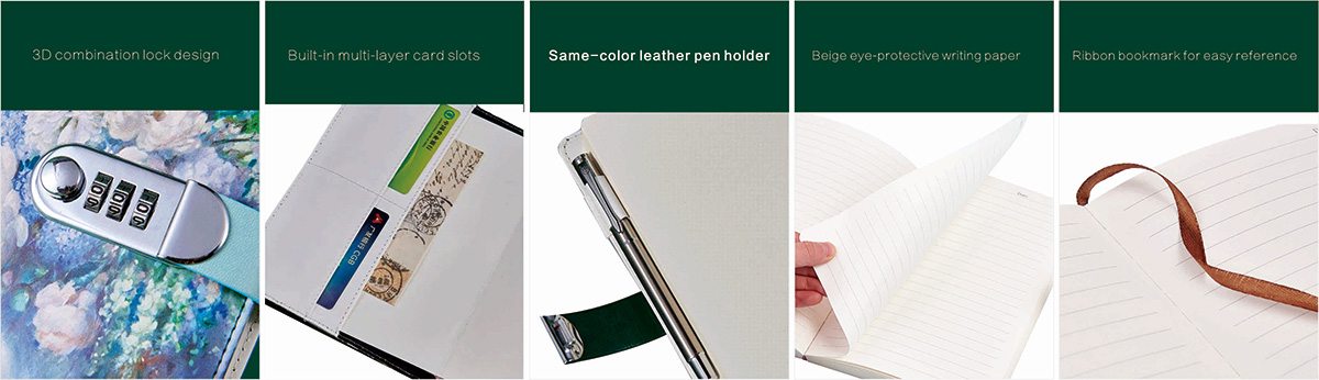 Wir bieten umfassende individuelle Dienste an. Sie können das Covermaterial, das Muster und das exklusive Text und das exklusive Logo entsprechend Ihren Vorlieben auswählen. Wir können auch das innere Seitenlayout anpassen - von gemeinsamen horizontalen Linien, Punkten, Quadraten, Rohlingen oder Cornell -Notizseiten bis hin zu Seiten in spanischen, Englisch, Portugiesischen, Russischen, Italienisch, Arabisch und anderen spezifischen Sprachen. Egal, ob es sich um den persönlichen Gebrauch oder das Geschenk an Verwandte und Freunde handelt, das maßgeschneiderte abschließbare Tagebuch ist einzigartig und wird zu einem außergewöhnlichen Geschenk, das exklusive Emotionen und Erinnerungen trägt.